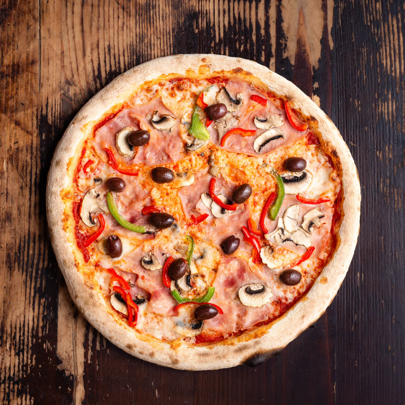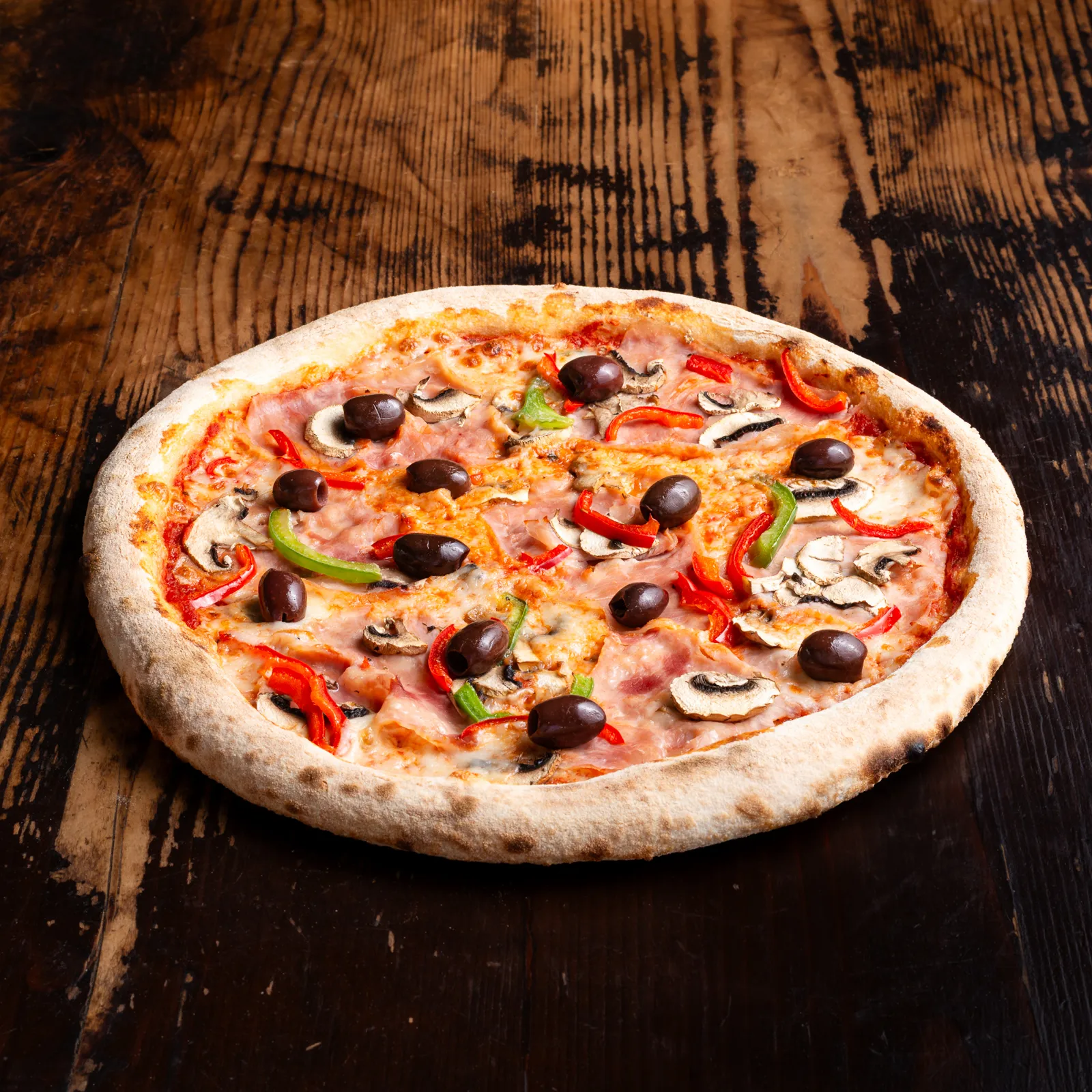 Ingrediente: aluat cu maia, sos roșii, mozzarella, prosciutto cotto, ciuperci, ardei, măsline kalamata, oregano