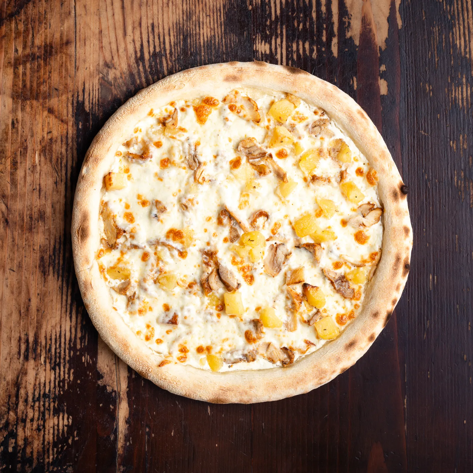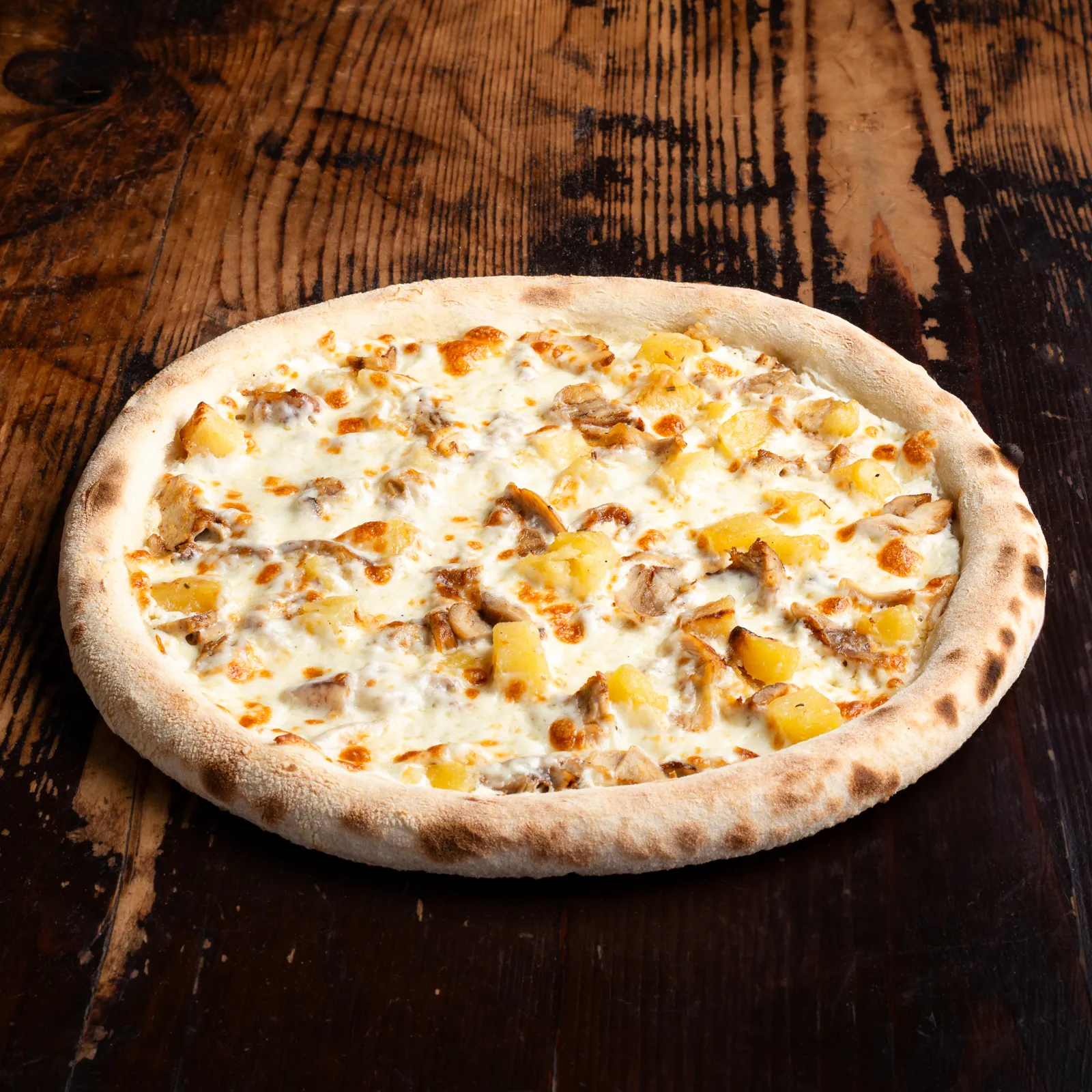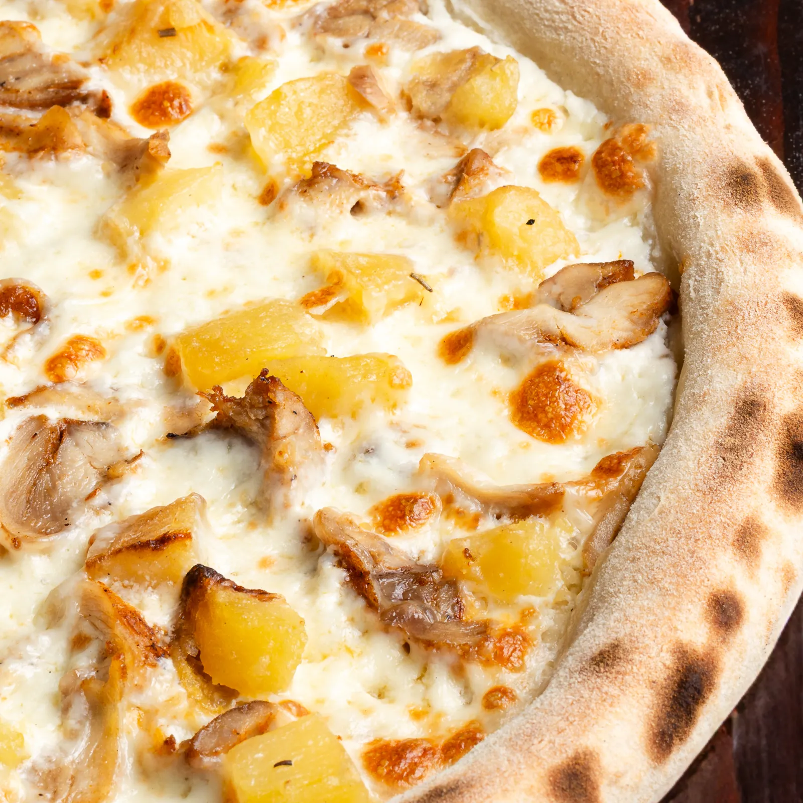 aluat cu maia, sos alb, mozzarella, cartofi, carne de pui, oregano