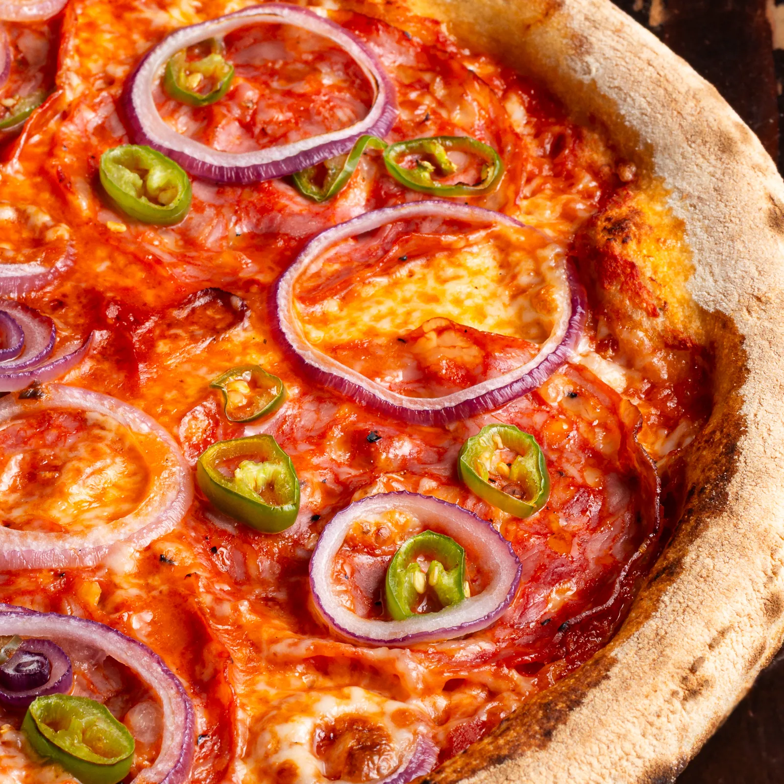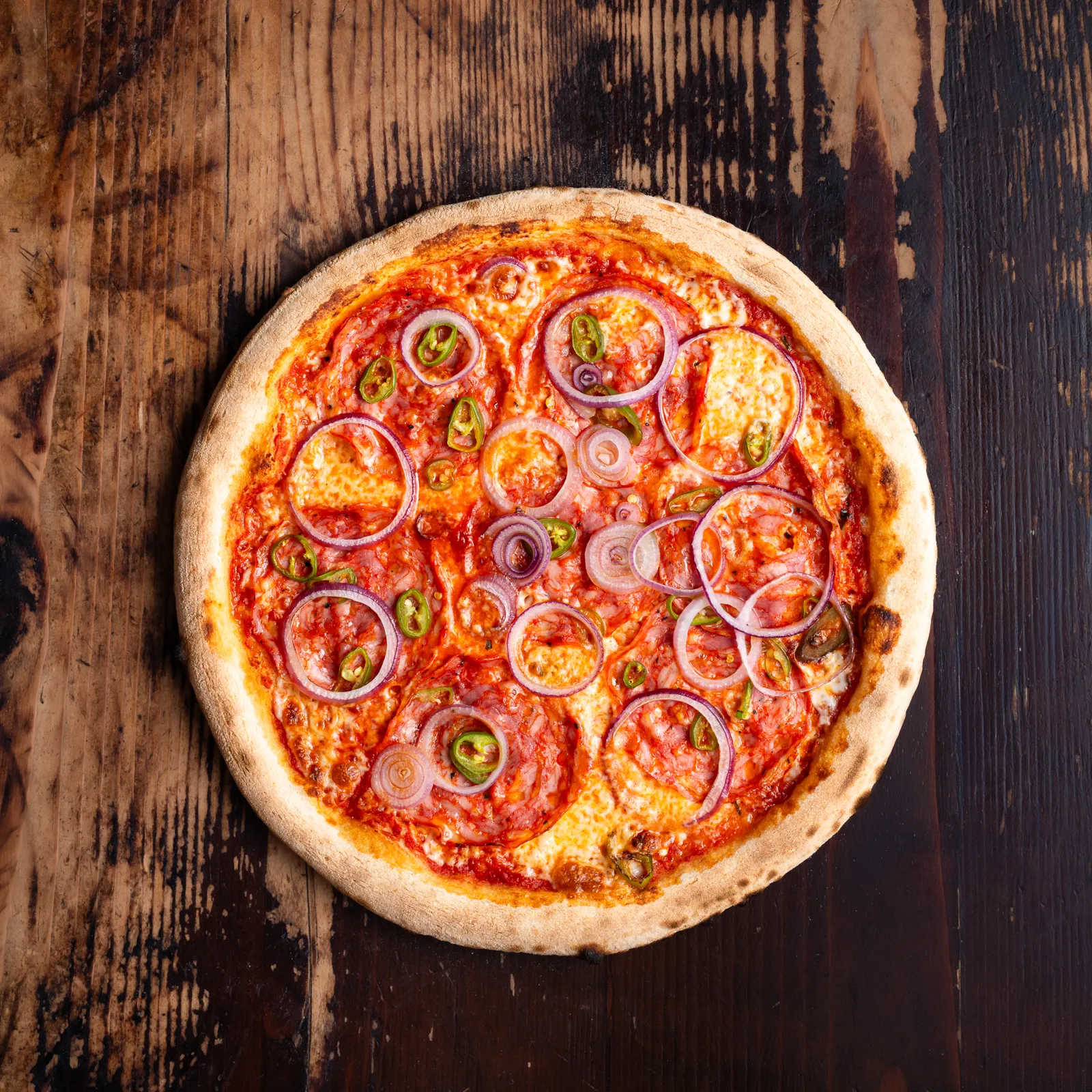 aluat cu maia, sos roșii, mozzarella, salam picant Ventricina, ardei iute, ceapă roșie,