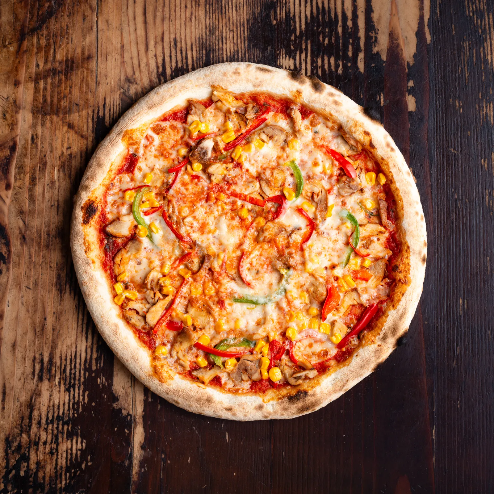 aluat cu maia, sos roșii, mozzarella, carne de pui, ardei, boabe porumb, oregano