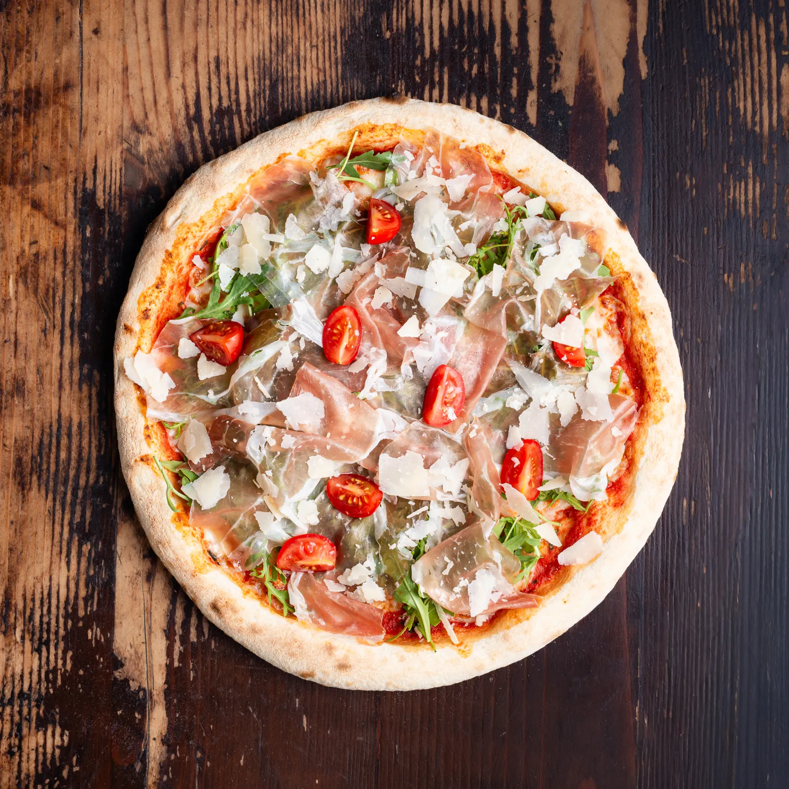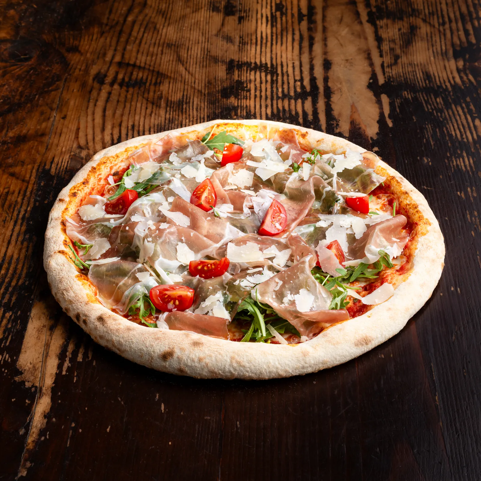 aluat cu maia, sos roșii, mozzarella, prosciutto crudo, rucola, roșii cherry, parmezan, oregano