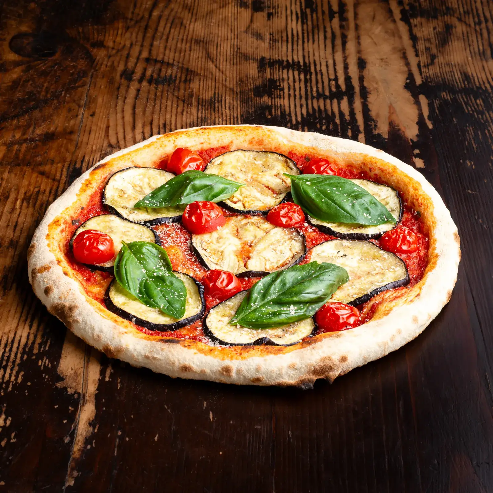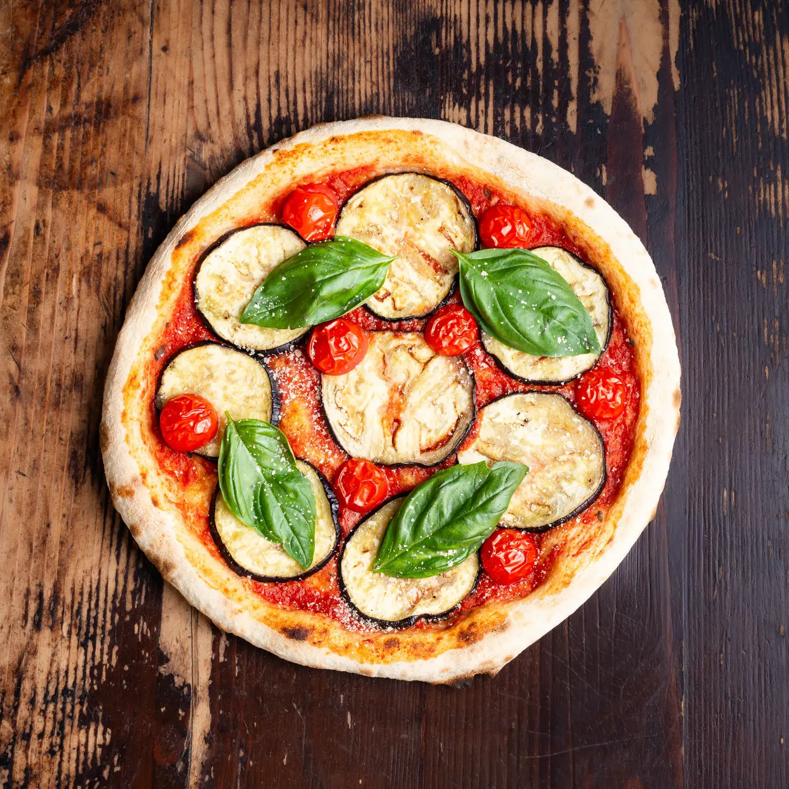 aluat cu maia, sos roșii, vinete, roșii cherry, drojdie inactivă, busuioc proaspăt, ulei de măsline, oregano