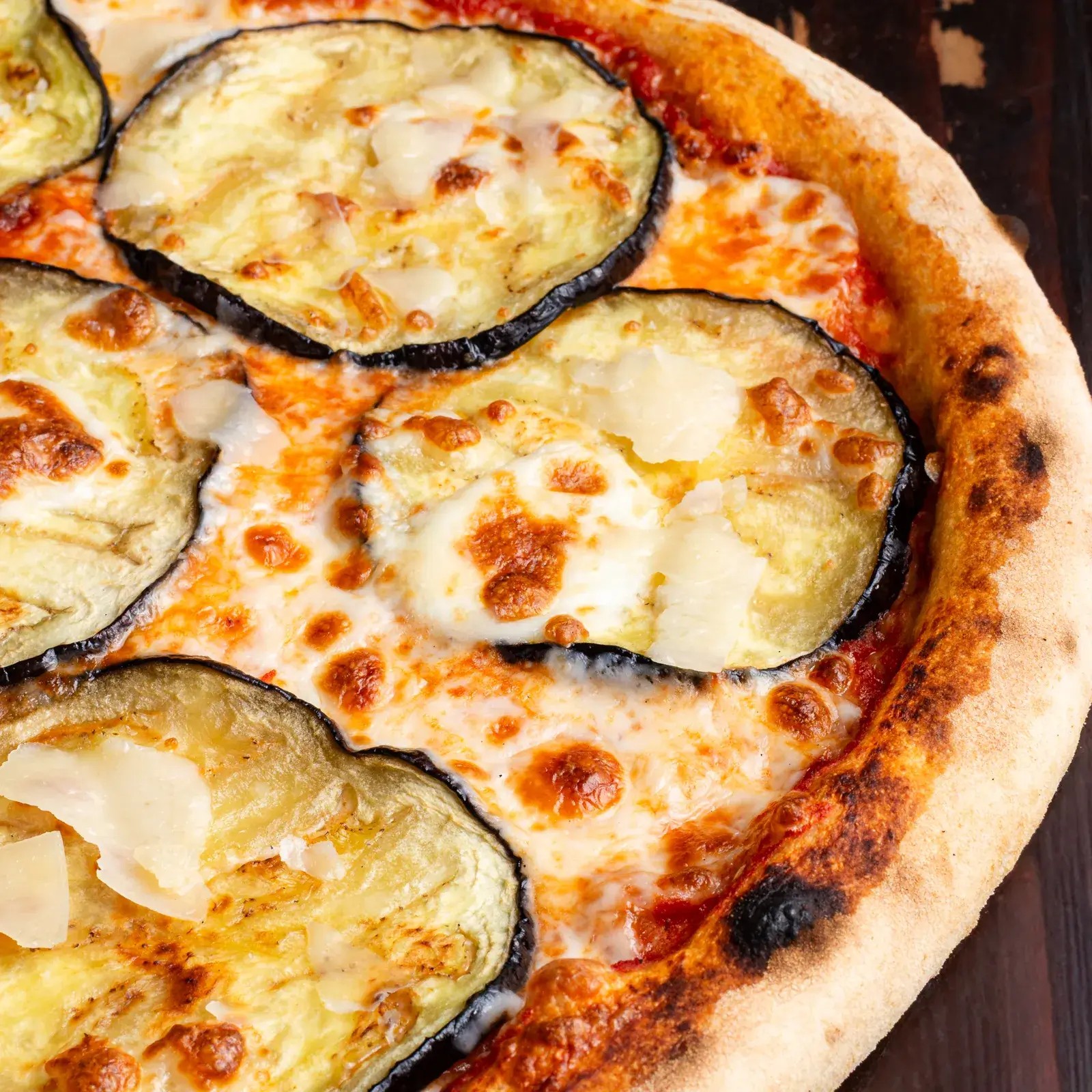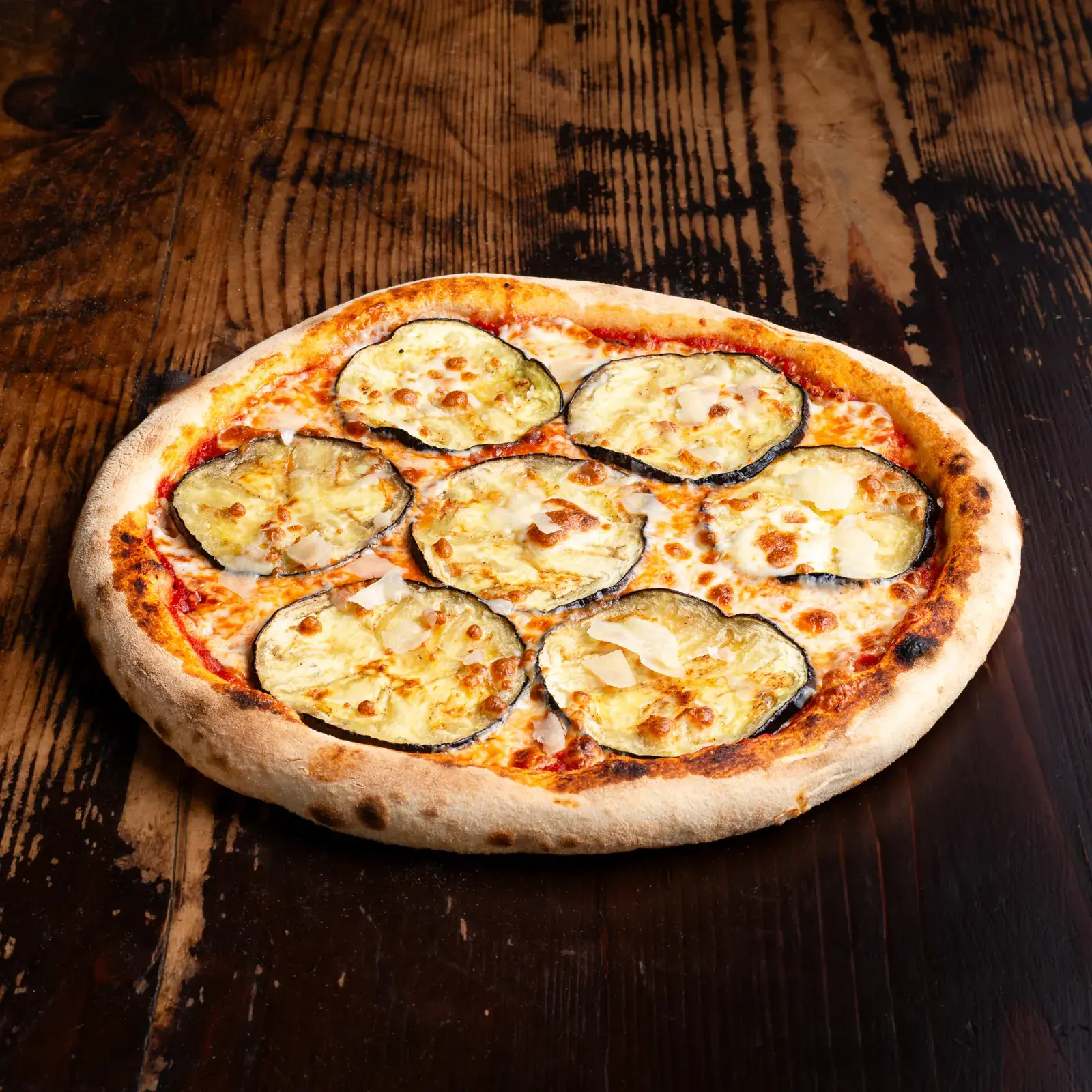 aluat cu maia, sos roșii, mozzarella, vinete, parmezan, oregano