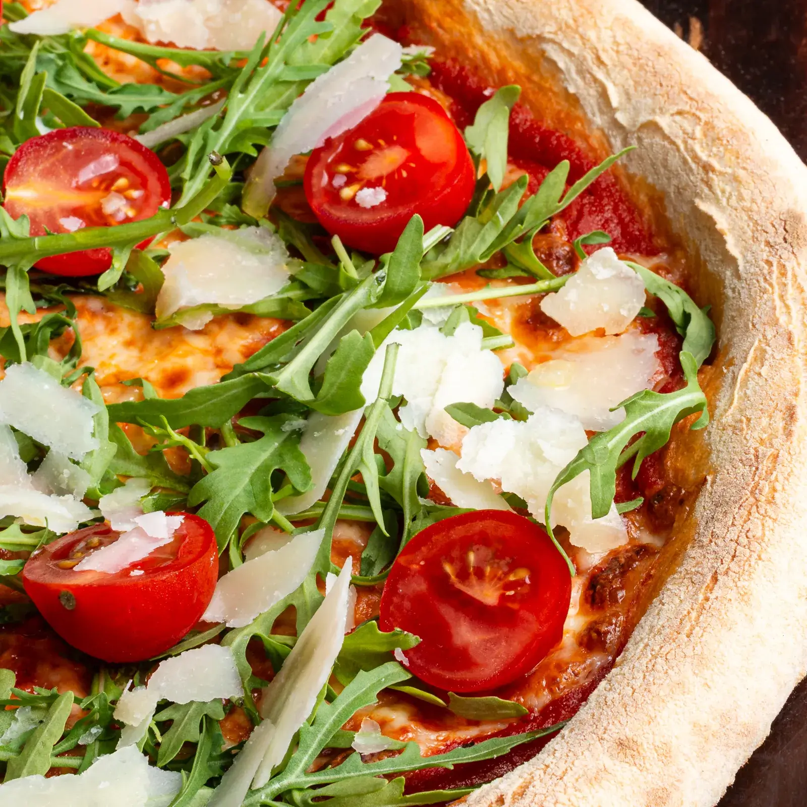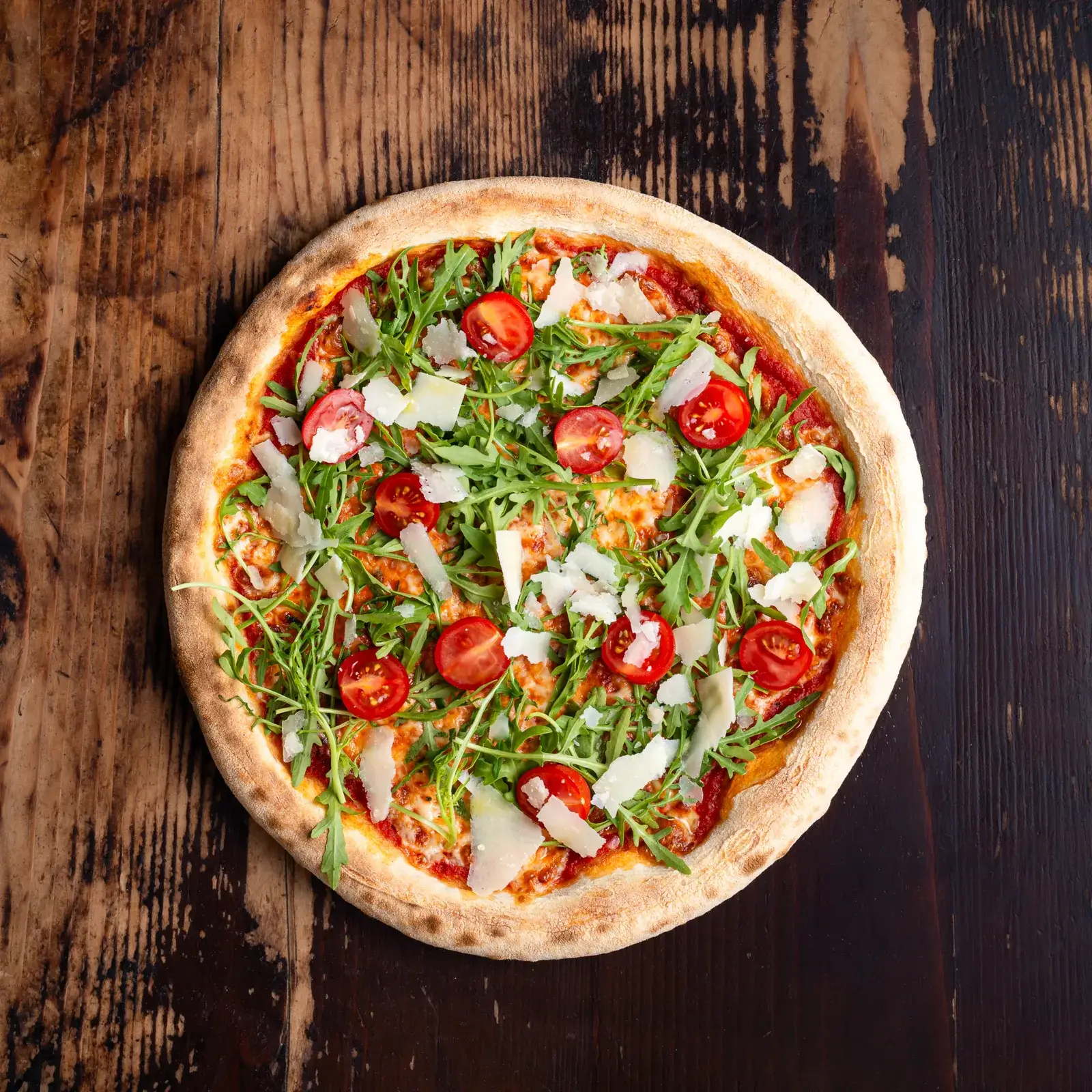 aluat cu maia, sos roșii, mozzarella, roșii cherry, rucola, parmezan, oregano