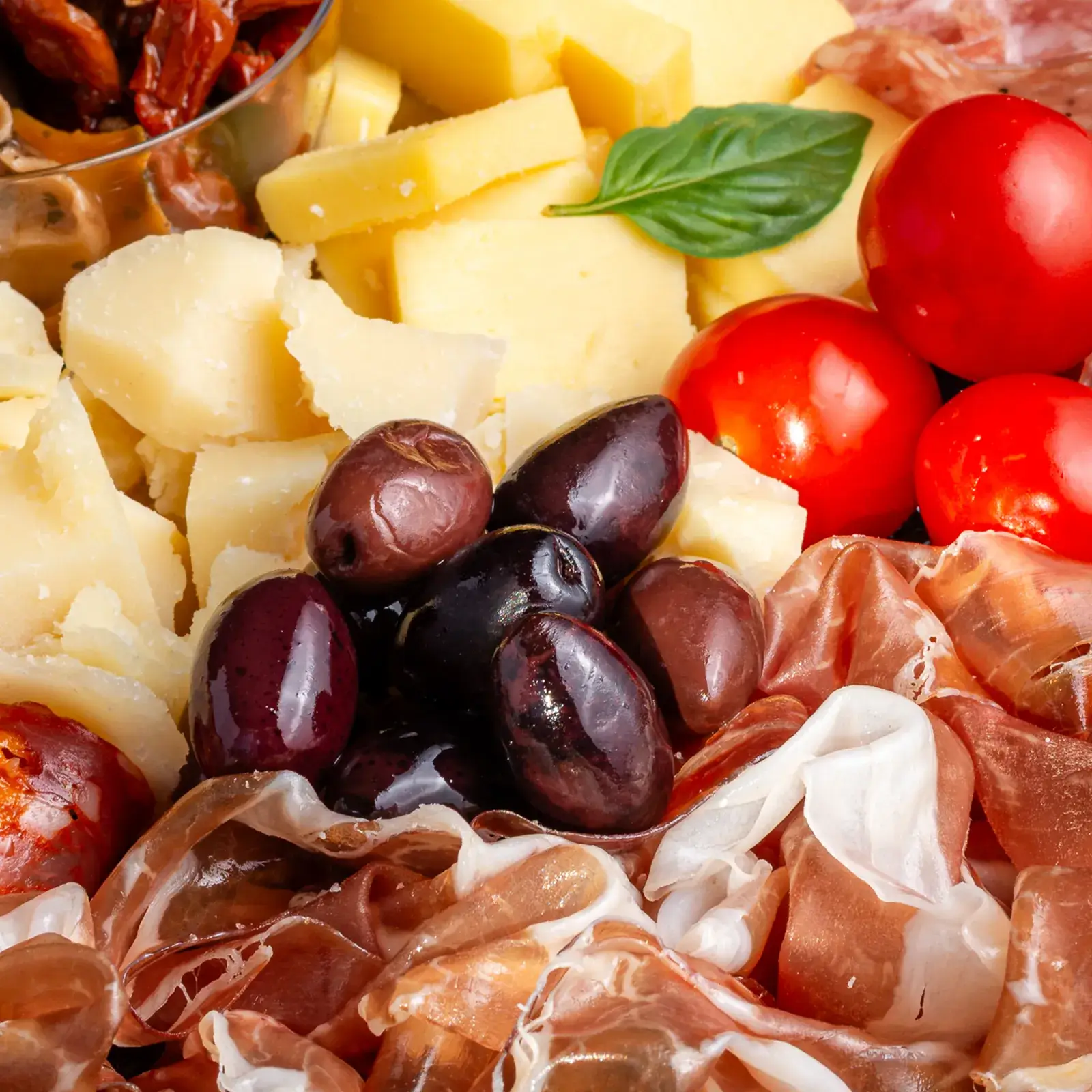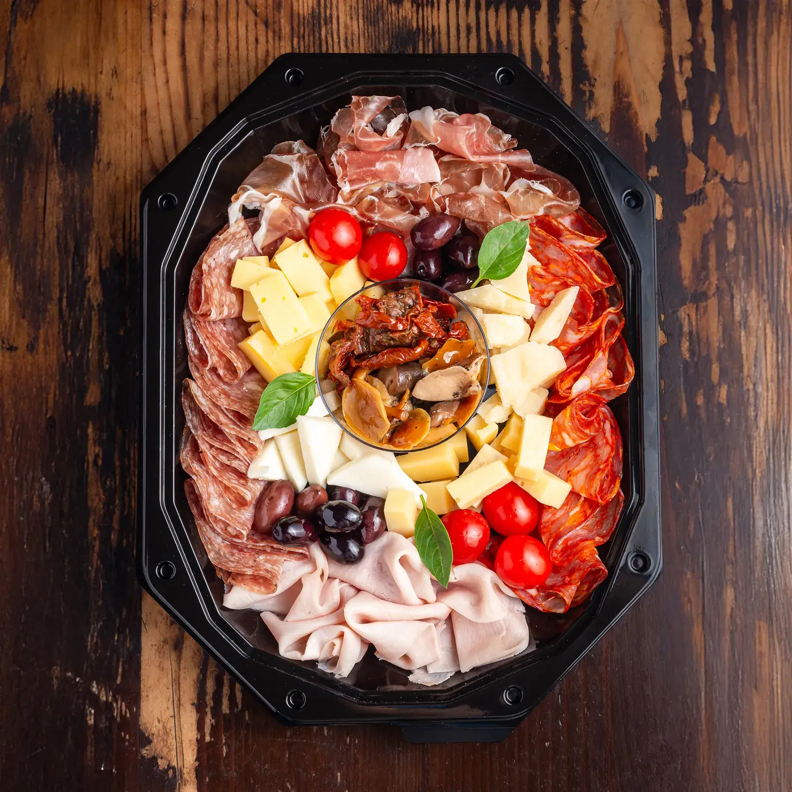 prosciutto cotto, prosciutto crudo San Daniele, salam Milano, salam Ventricina, Grana Padano, cașcaval afumat, Brie, Emmentaler, mozzarella fior di latte, mix de ciuperci, roșii uscate, măsline, roșii cherry